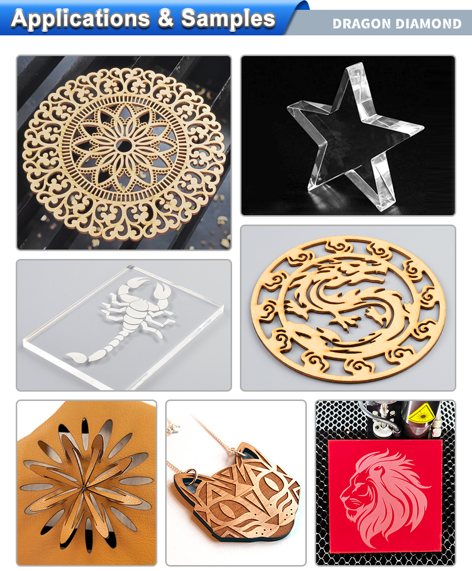 Leather, cloth, wool, fur, acrylic, Plexiglas, wooden board, plastic, resinand other Non-metal Materials engraving cutting work. clothing, greetingcards, electronic components, plastics, models, pharmaceuticalpackaging, building ceramics, fabric cutting, advertising industry, etc.