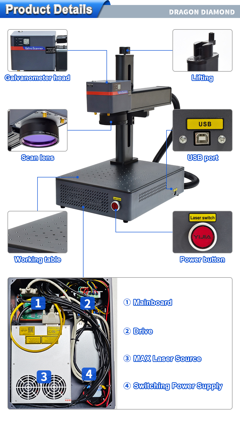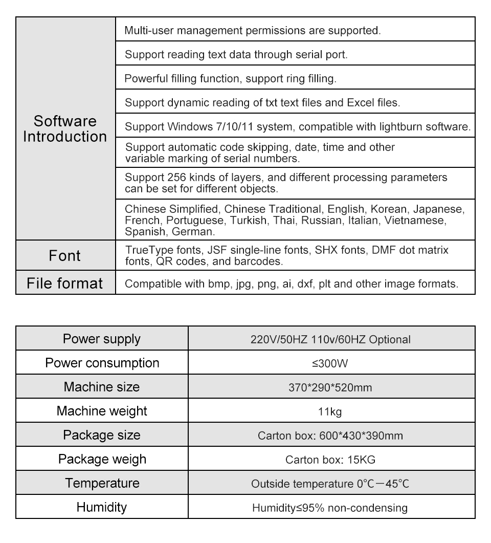 NO. Model LZ-1325L 1 Working Area 1300mm*2500mm (98*51 in) 2 Table Type Blade Sheet Table 3 Laser tube type CO2 sealed laser tube 4 Laser power 90W-300W 5 Focus Lens Imported Lens 6 Motor & Driver Stepper Motor / Servo Motor 7 Position System Red Light Pointer 8 Controller RUIDA 6445 9 Cooling Function Water Chiller CW3000/CW5000/CW5200 10 Machine power <3000W 11 Software RD works 12 Power supply AC 110/220V 50/60Hz, single phase 13 Graphic format supported BMP/JPG/DXF/WMF/EMF/PLT 14 Package 2150*3250*1500mm 15 G.W. 900KG 16 Package Wooden Box 17 Warranty 1 year (Laser tube 10 months) 18 Optional Parts UP&DOWN table, Rotation axis, Auto focus